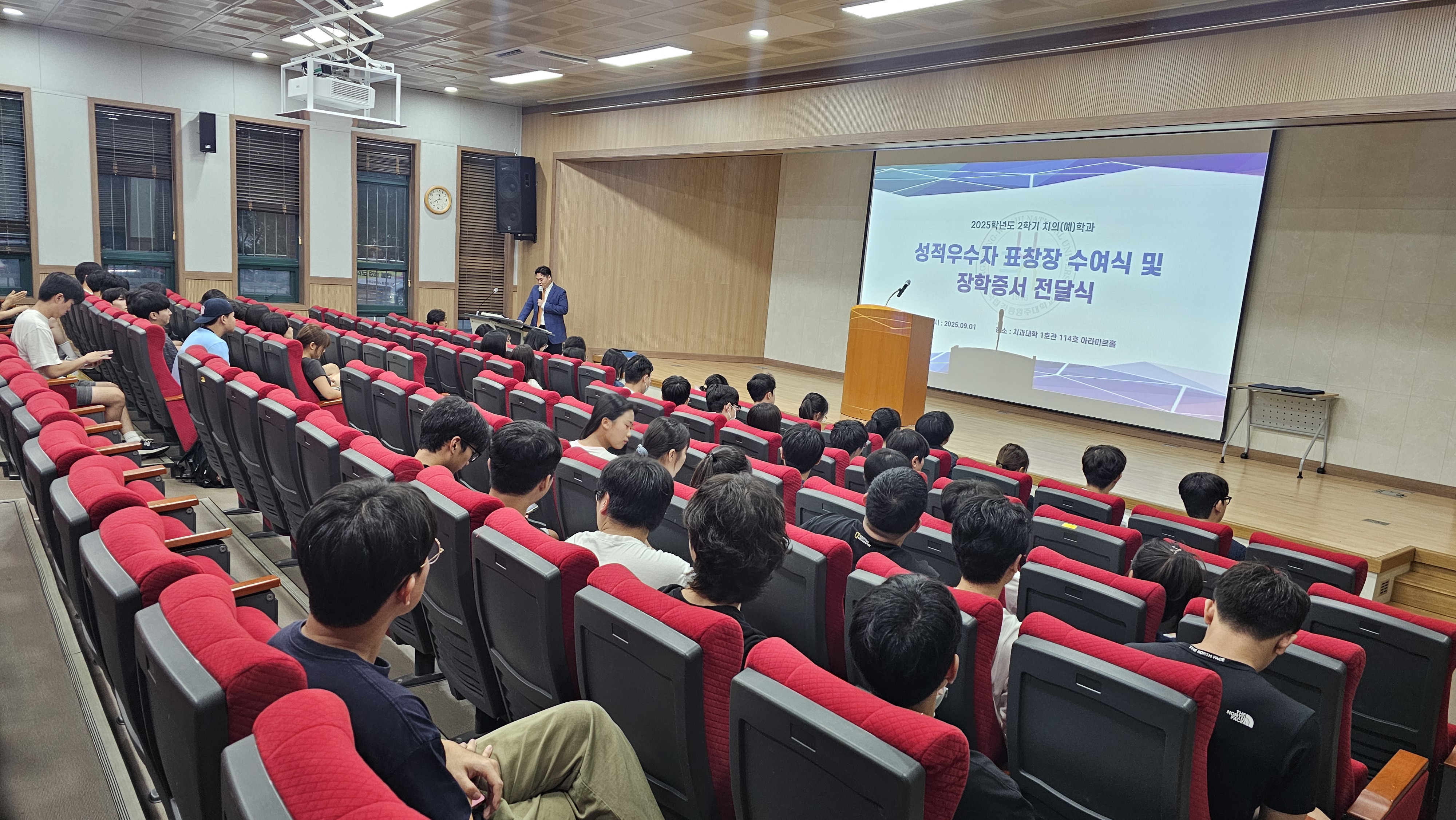 치과대학 치의(예)학과 2학기 성적우수 표창장 수여식 및 장학증서 전달식이 지난 2025년 9월 1일 아라미르홀에서 개최되었다. 치의학과장, 치의예과장, 치의(예)학과 학생들이 아라미르홀에 모인 가운데 진행된 본 행사에서는 지난학기 각 학년 성적 평점 1등에 대한 표창장이 수여 되었으며, 신흥연송 장학금, 오스템 임플란트 장학금, 국립강릉원주대학교 치의학과 총동창회 장학금, 덴티움 장학금 수상자들을 대상으로 장학증서가 전달되었다. 유기연 치의학과장은 표창장 및 장학증서 수상자의 노고를 치하하였다.
