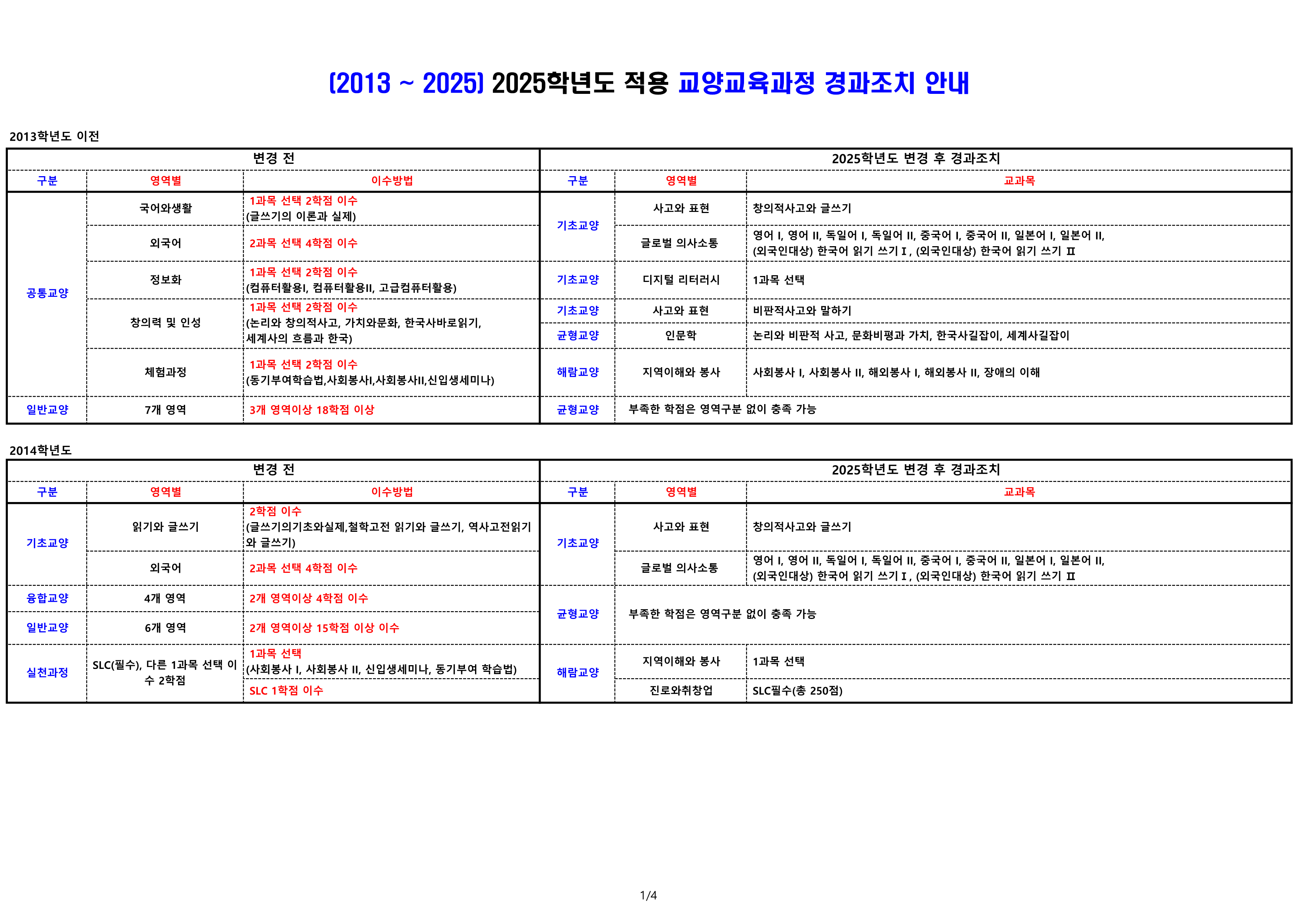 2025학년도 교육과정 개편에 따른 교양 경과조치 안내