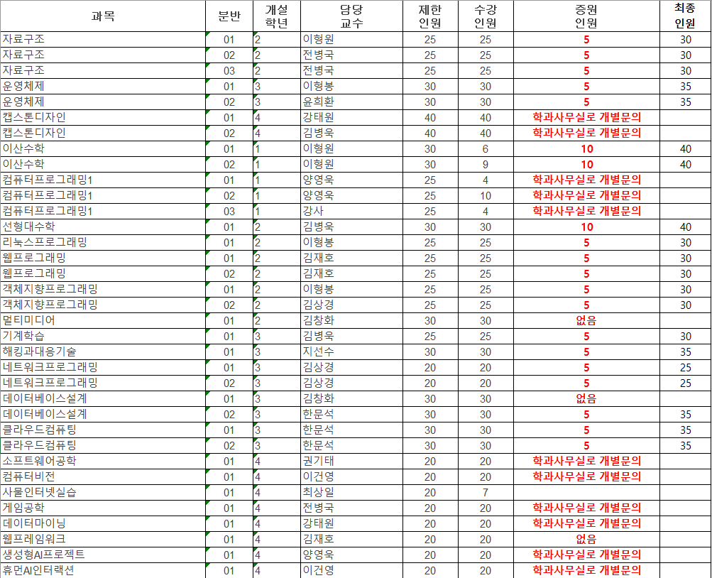 2. 신청방법: 증원인원이 있는 교과목의 경우 수강신청 사이트에서 변경기간에 선착순 신청