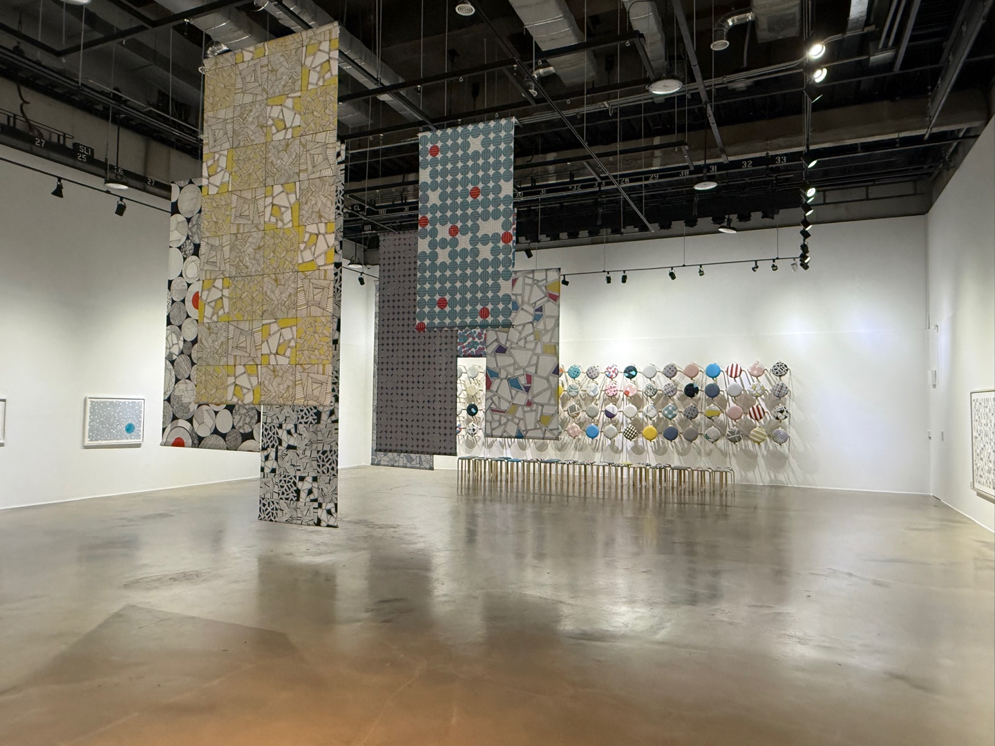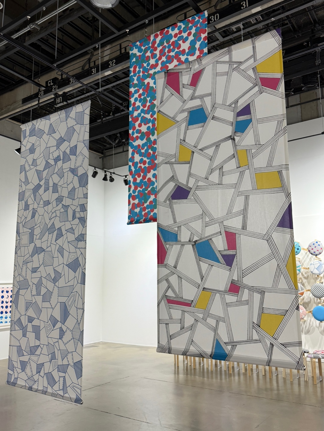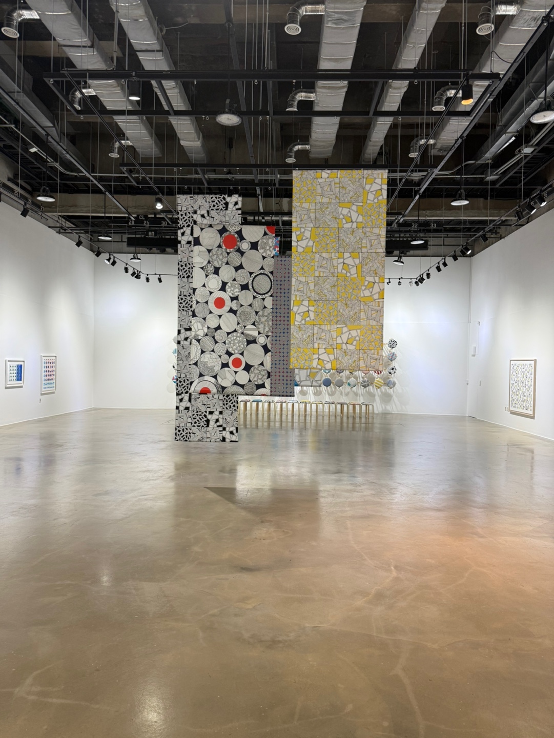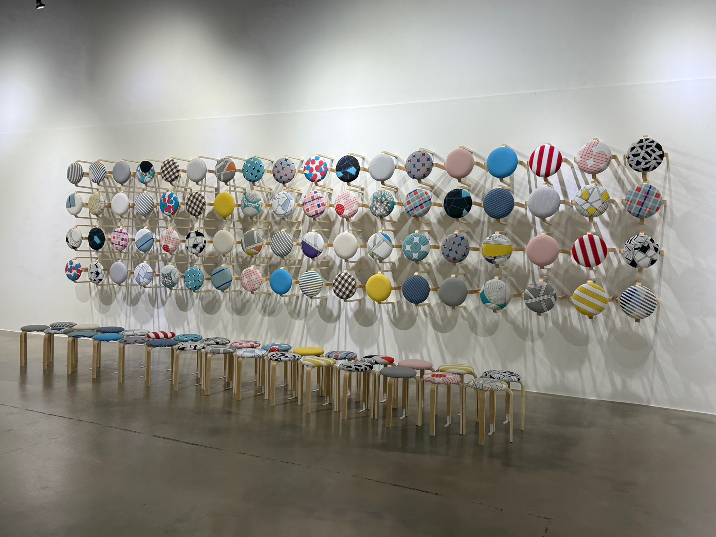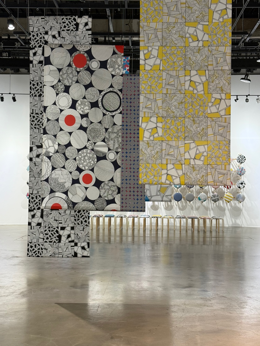 이를 활용하여 스툴에 다양한 디자인을 전시하였고, 디지털 텍스타일 프린팅을 이용한 원단 설치, 펜드로잉을 활용한 작품 제작 등을 전시에서 선보였습니다.