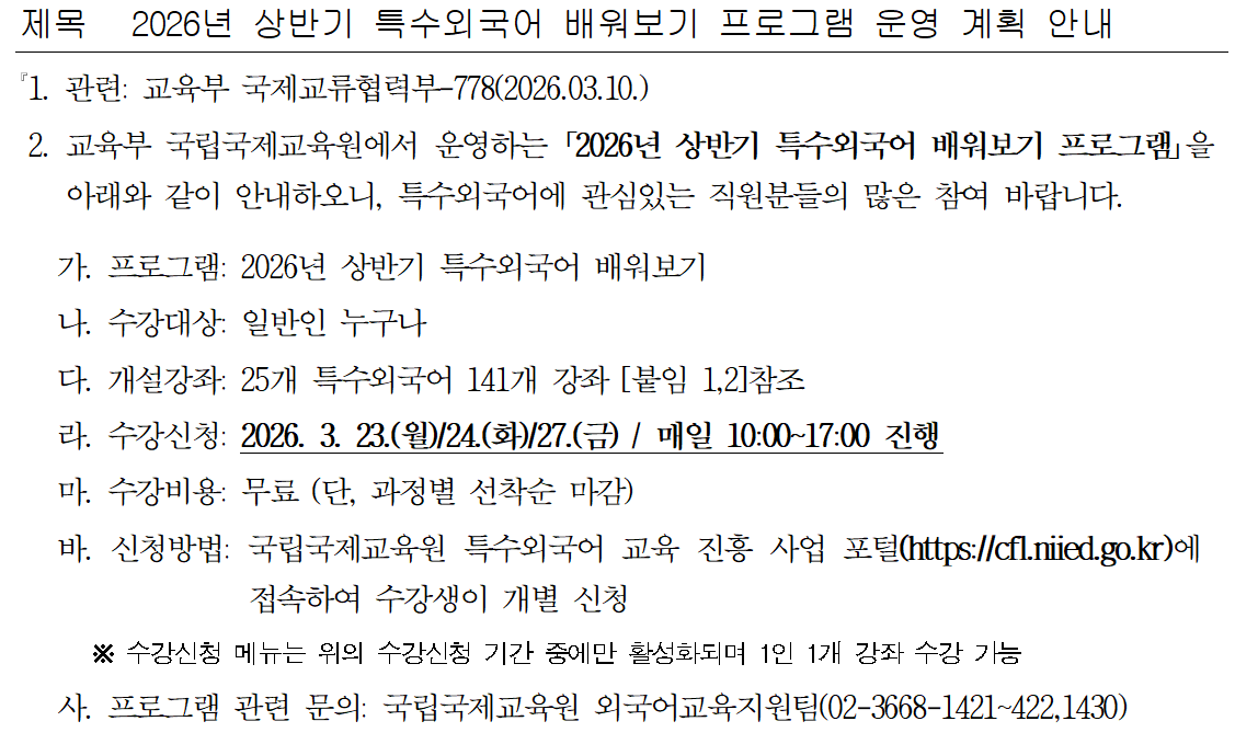 2026년 상반기 특수외국어 배워보기 프로그램 운영 계획 안내
