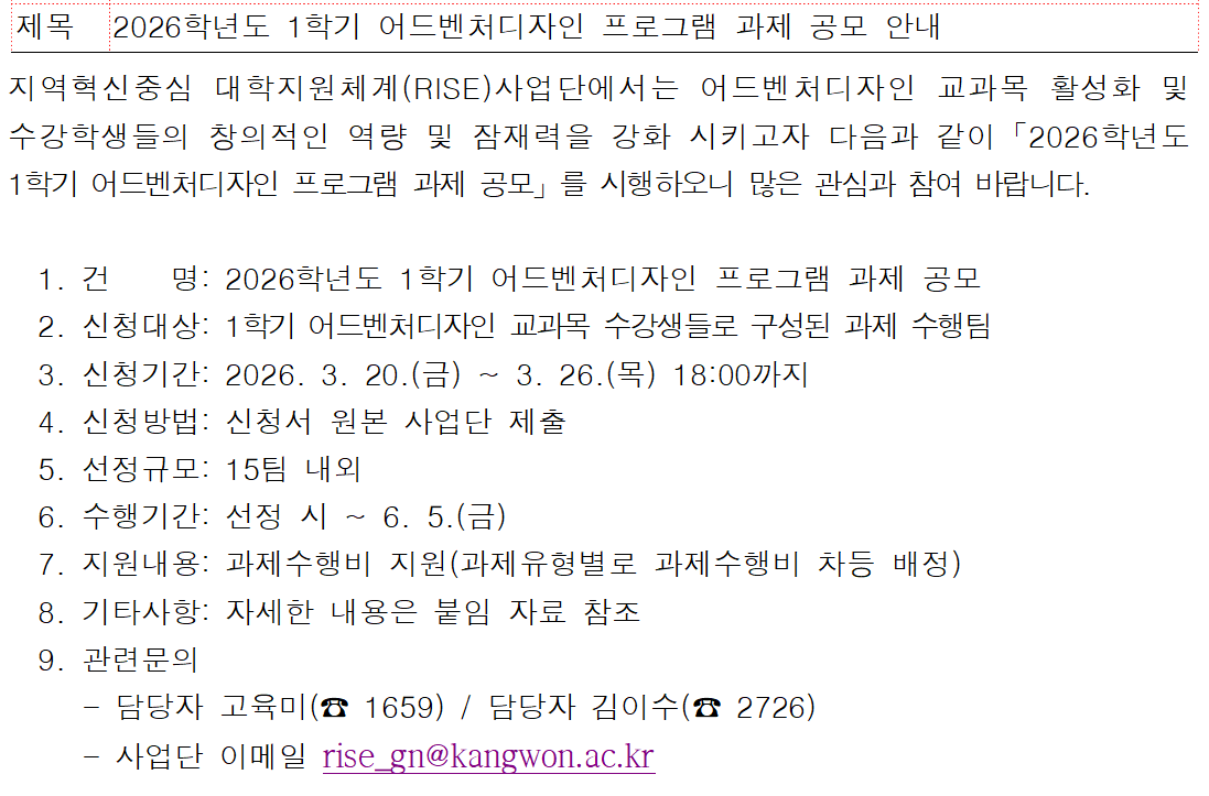 fnctId=bbs,fnctNo=881 2026학년도 1학기 어드벤처디자인 프로그램 과제 공모 안내 작성일 2026.03.20 작성자 홍승연 조회수 36 첨부파일 첨부파일이(가) 없습니다.