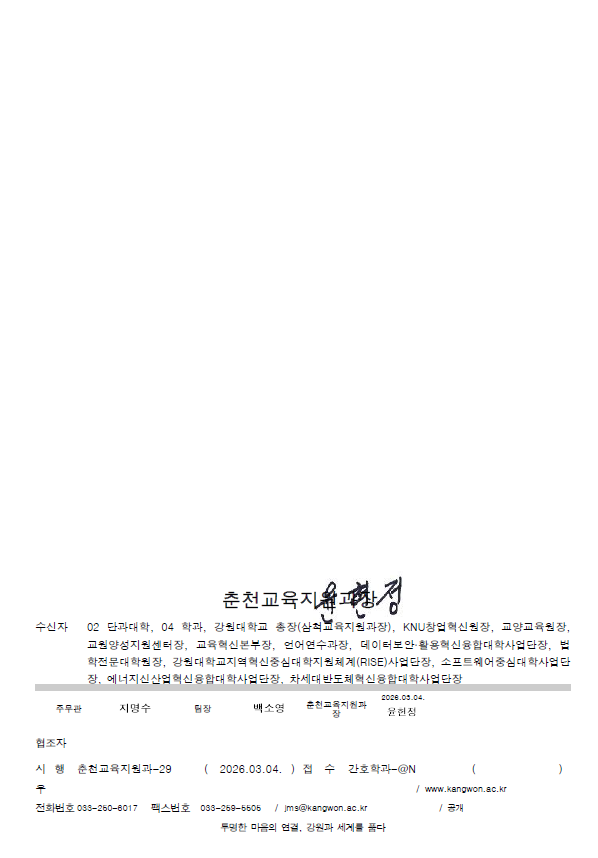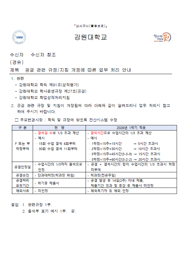 fnctId=bbs,fnctNo=840 공결 관련 규정 및 지침 개정에 따른 공결 제출 절차 안내(서식 포함) 사항입니다. 작성일 2026.03.04 작성자 원민정 조회수 393 공결 관련 규정 및 지침 개정에 따른 공결 제출 절차 안내(서식 포함) 사항입니다. 주요변경사항 확인 바랍니다. 첨부파일 공결 관련 규정_지침 개정에 따른 업무 처리 안내.pdf 1.공결관련규정.hwp 출석부표기예시.hwp