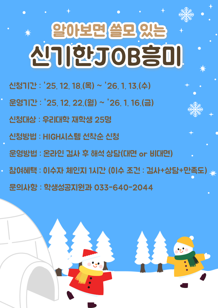 fnctId=bbs,fnctNo=1046 [학생성공지원과] 알쓸신JOB(STRONG 직업흥미검사) (12월) 작성일 2025.12.18 작성자 학생성공지원과 조회수 788 첨부파일 첨부파일이(가) 없습니다.