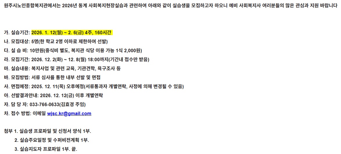 fnctId=bbs,fnctNo=849 [2026-동계] 원주시노인종합복지관 실습생 모집 안내(~12/8) 작성일 2025.11.28 작성자 박아름 조회수 803 첨부파일 원주시노인종합복지관 2026년 동계 사회복지현장실습 첨부파일.hwp
