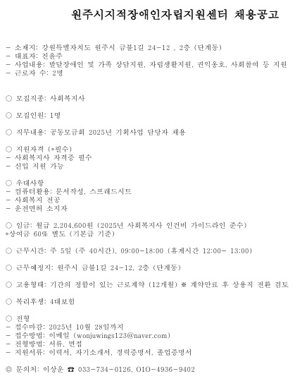 fnctId=bbs,fnctNo=850 원주시지적장애인자립지원센터 채용공고(~10.28.까지) 작성일 2025.10.20 작성자 박아름 조회수 1087 첨부파일 첨부파일이(가) 없습니다.